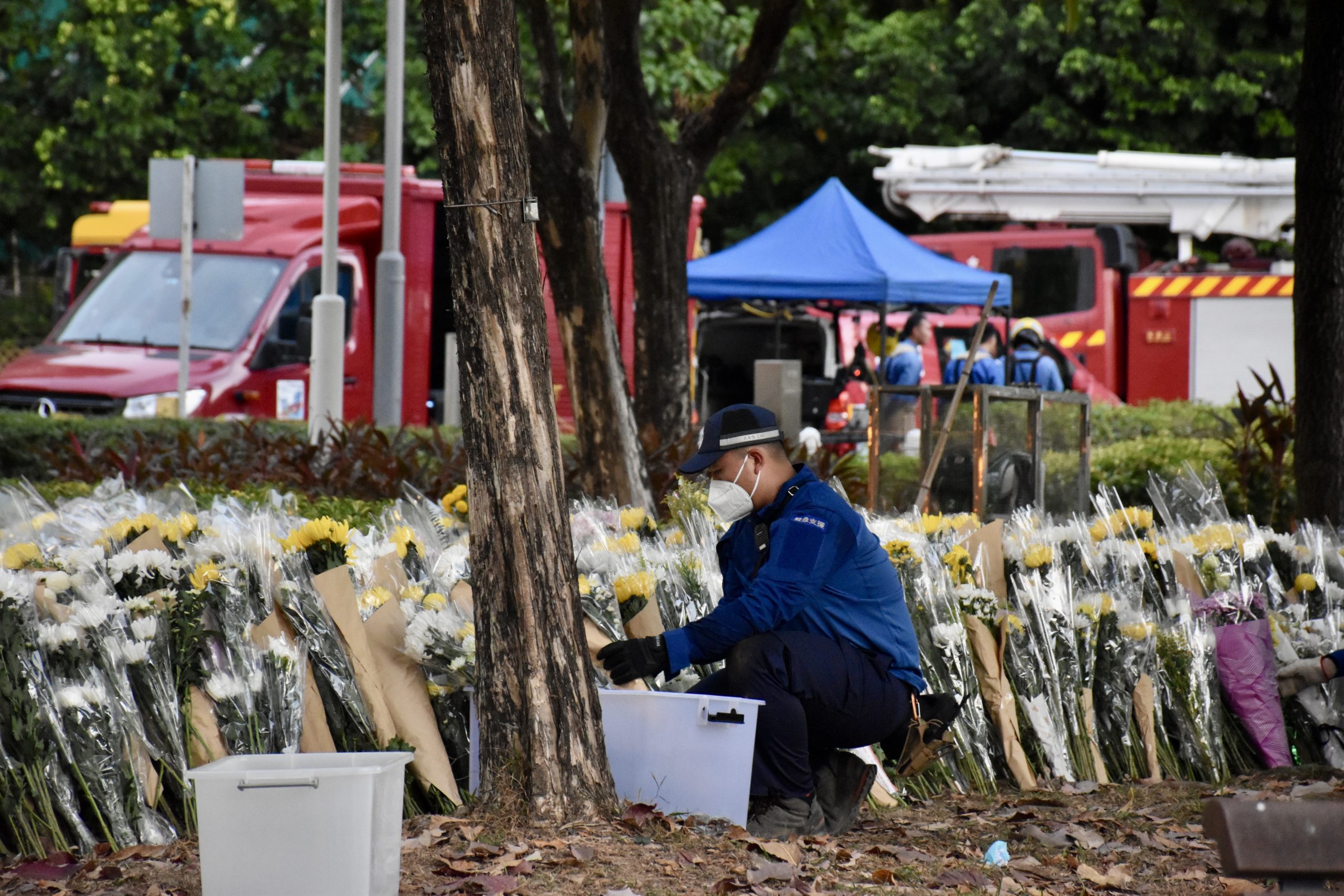 Bouquets of white and yellow flowers fill the memorial area near Wang Fuk Court, where residents leave handwritten messages mourning the Tai Po fire victims. (Vinci Ao Wei-ying, The Young Reporter)A Civil Aid Service officer arranges bouquets laid by the public near Wang Fuk Court, as mourning continues for the Tai Po fire victims. (Gigi Ho Wing-chi, The Young Reporter)A Civil Aid Service officer arranges bouquets laid by the public near Wang Fuk Court, as mourning continues for the Tai Po fire victims. (Gigi Ho Wing-chi, The Young Reporter)Residents gather in silent prayer near Wang Fuk Court to mourn the victims of the Tai Po fire.(Gigi Ho Wing-chi, The Young Reporter)Mourners line up at the Kwong Fuk Sitting-out Area to pay their respects. (Vinci Ao Wei-ying, The Young Reporter)A funeral flower wreath bearing the words “Pain — From Hongkongers” places at the memorial site. (Vinci Ao Wei-ying, The Young Reporter)Hong Kongers place flowers to mourn the victims of the Tai Po fire. (Vinci Ao Wei-ying, The Young Reporter)Hundreds of handwritten notes cover the pillars of a pavilion near Wang Fuk Court.(Vinci Ao Wei-ying, The Young Reporter)Hundreds of handwritten notes cover the pillars of a pavilion near Wang Fuk Court. (Vinci Ao Wei-ying, The Young Reporter)Hong Kongers fill a tunnel wall with penned messages of support and condolence for victims of the Tai Po fire. (Gigi Ho Wing-chi, The Young Reporter)Hong Kongers fill a tunnel wall with penned messages of support and condolence for victims of the Tai Po fire. (Vinci Ao Wei-ying, The Young Reporter)Hong Kongers fill a tunnel wall with penned messages of support and condolence for victims of the Tai Po fire. (Vinci Ao Wei-ying, The Young Reporter)