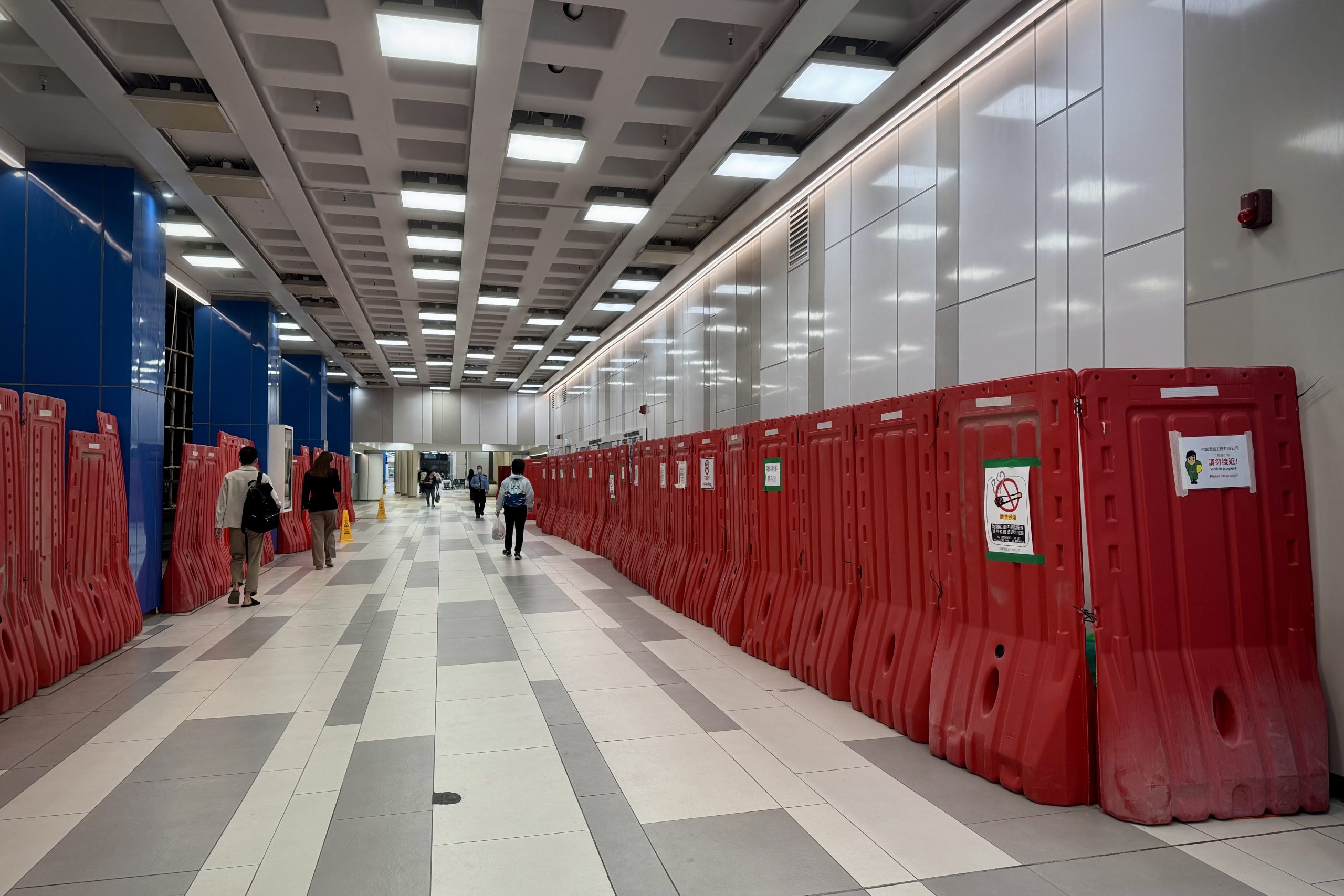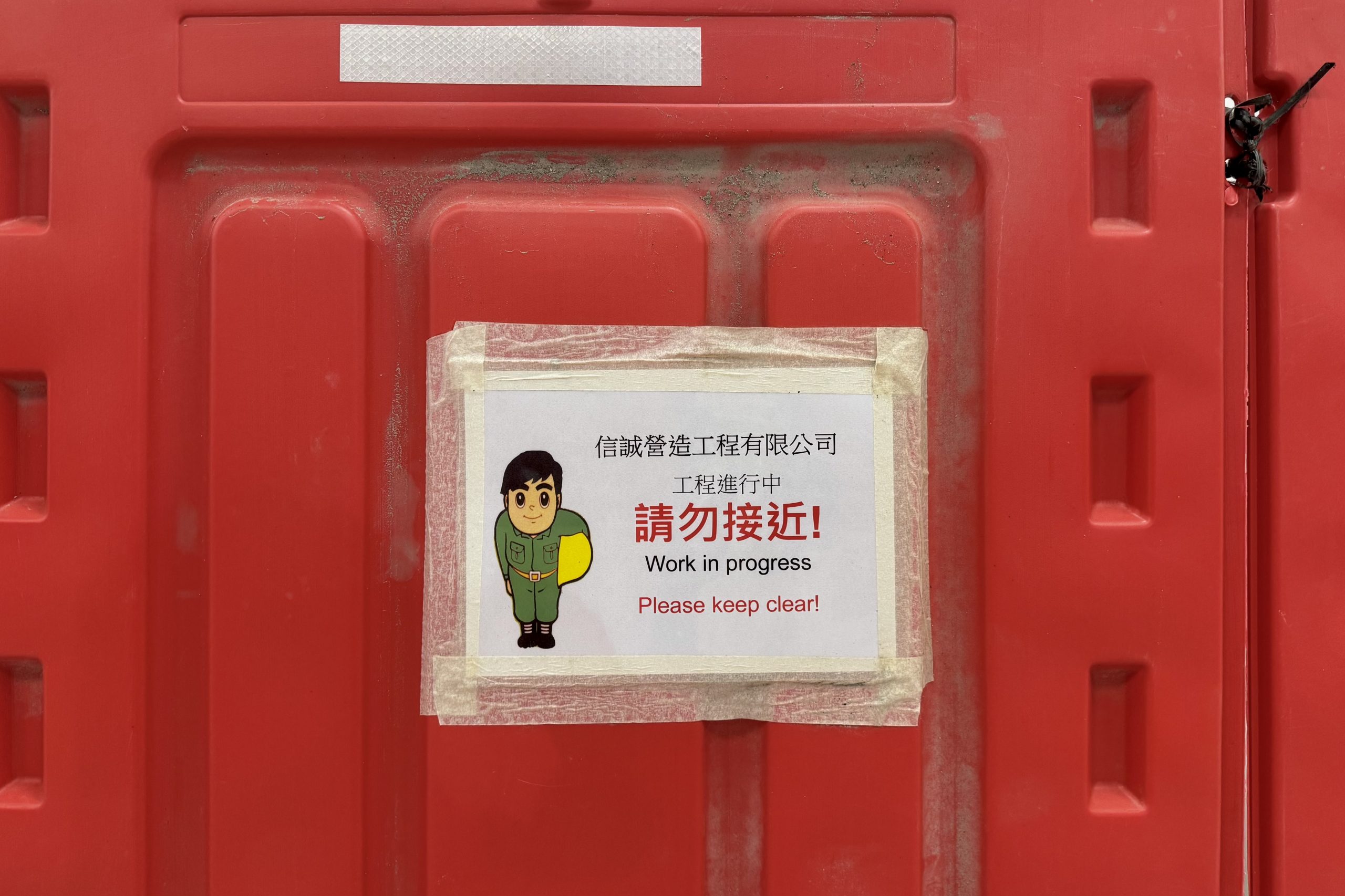 Red plastic hoardings around the board were labelled “temporary material storage zone” and “work in progress”. These barriers were extended to the nearby walls with no related messages.