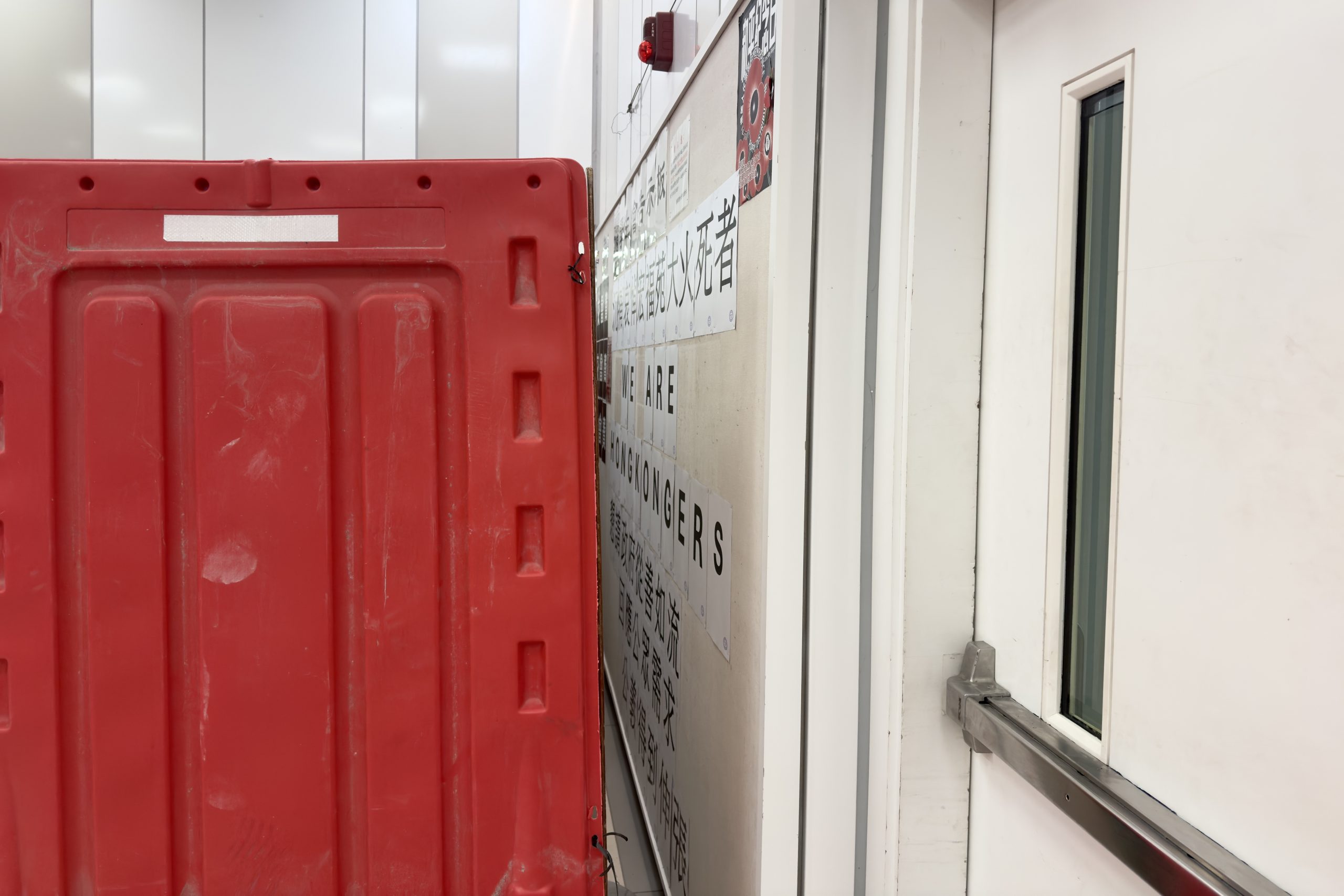 A message board run by the students' union at Hong Kong Baptist University with condolences for victims of the fatal Tai Po fire has been enclosed by white boards and red plastic barriers, covering the content from public view.
