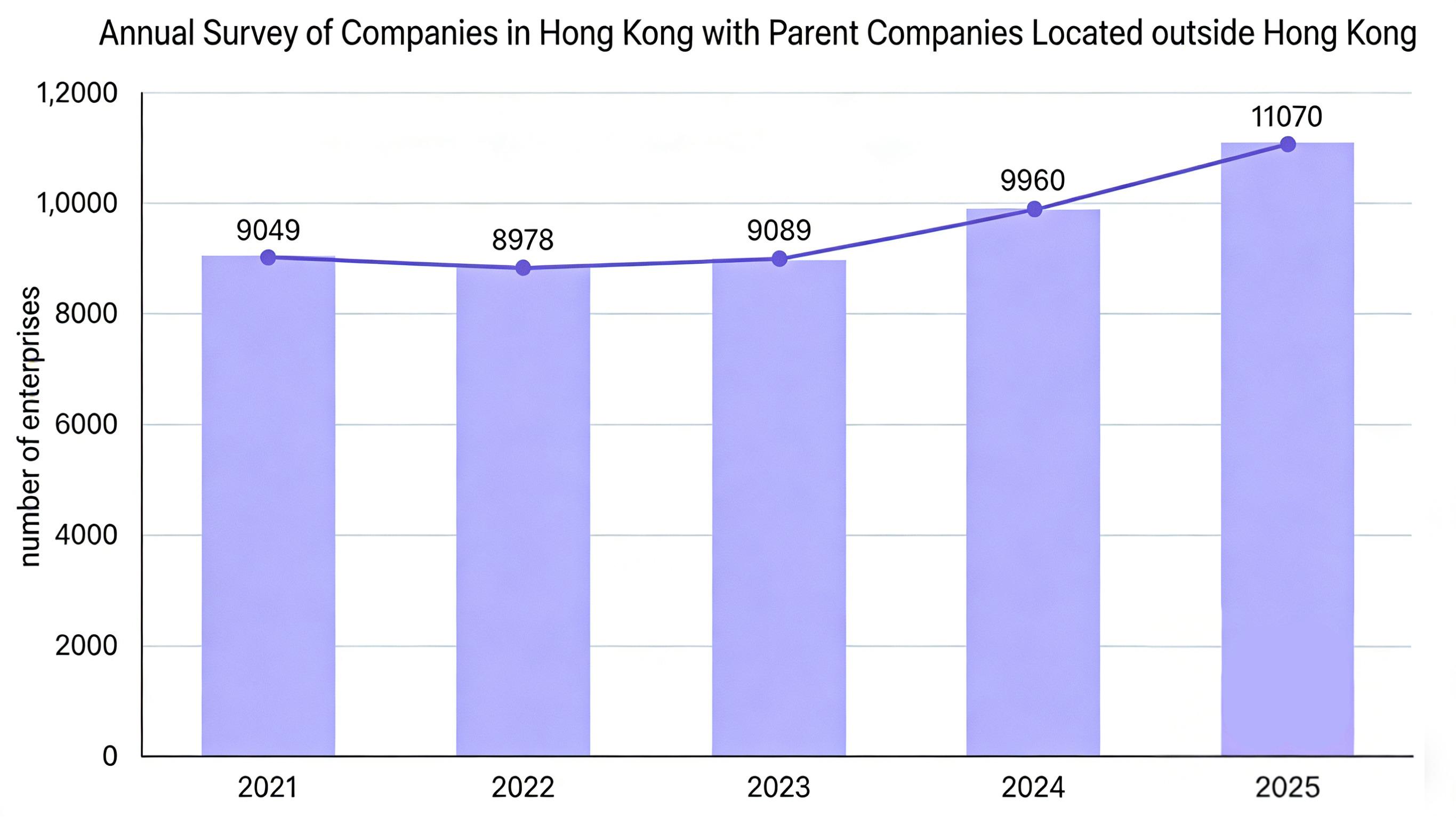 According to the Census and Statistics Department, the number of companies in Hong Kong with parent companies located outside Hong Kong has increased from 9,049 to 11,070 in four years, an increase of 22.3%.